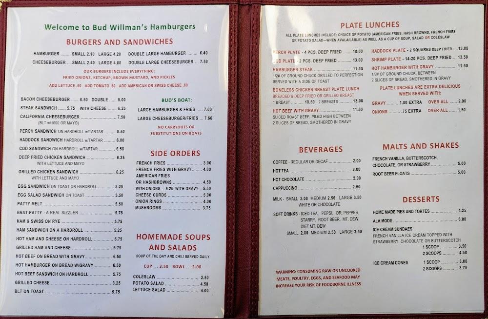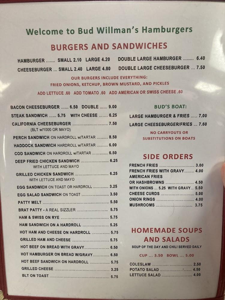 Discover Bud Willman's Lunch, a cozy gem located at 1901 Washington St, Manitowoc, WI. This beloved American restaurant specializes in mouth-watering hamburgers and offers a delightful menu featuring breakfast, lunch, and dinner options that showcase local specialties. Enjoy a relaxing, historic ambiance with fast service and a selection of excellent coffee and desserts. Perfect for solo dining or family outings, Bud Willman's provides accessible seating and facilities, making it welcoming for all. With takeout and delivery options available, indulge in comforting, simple dishes that cater to everyone, including a kid-friendly menu. Visit us today for an unforgettable dining experience!