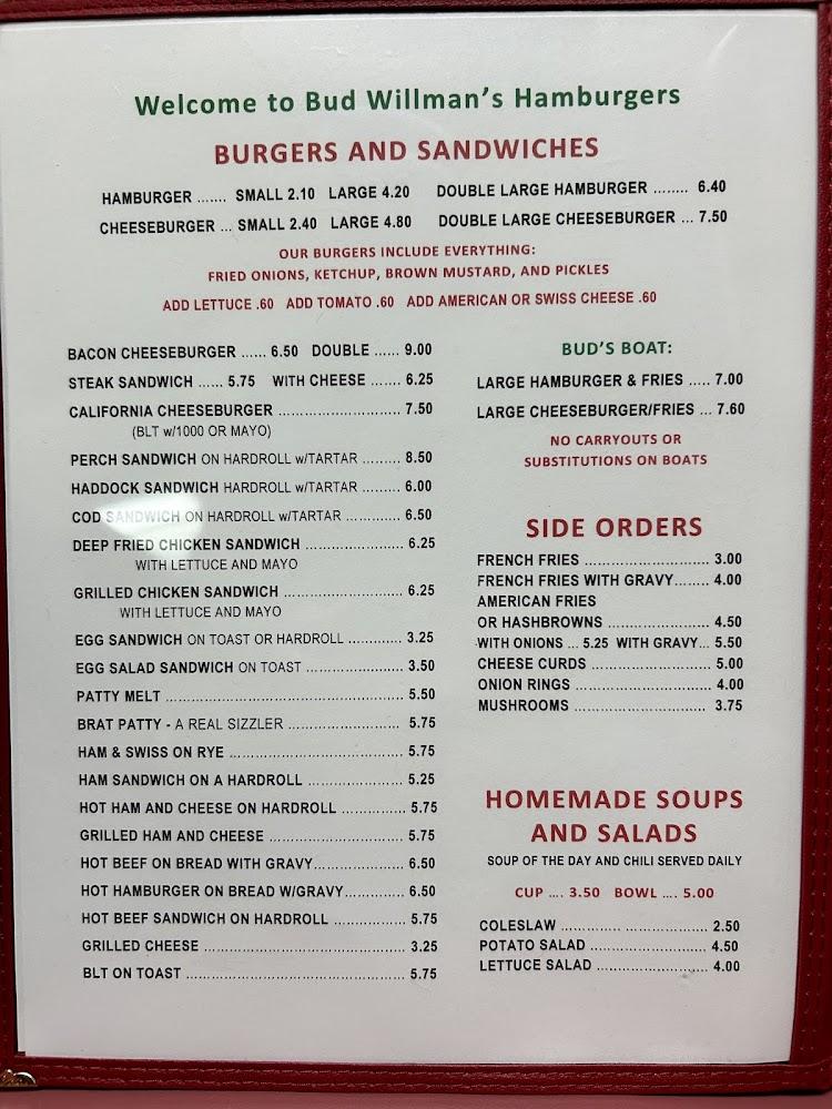 The menu at Bud Willman's Lunch is filled with traditional American dishes. Burgers come in various types, with fries or chili options available. Each burger is crafted for flavor and satisfaction. Popular items include the cheeseburger and the Hot Beef Plate.