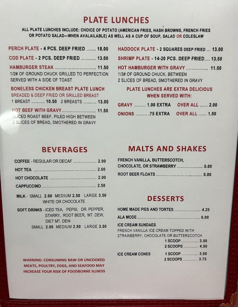 Homemade soups and salads enhance the meal choices, often made fresh each day. Don't forget dessert! They have an array of pies and ice cream treats to end the meal on a sweet note.